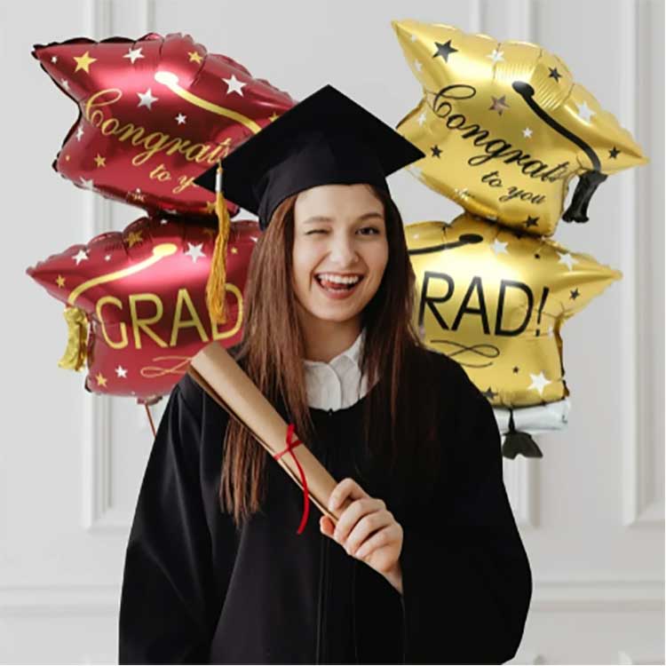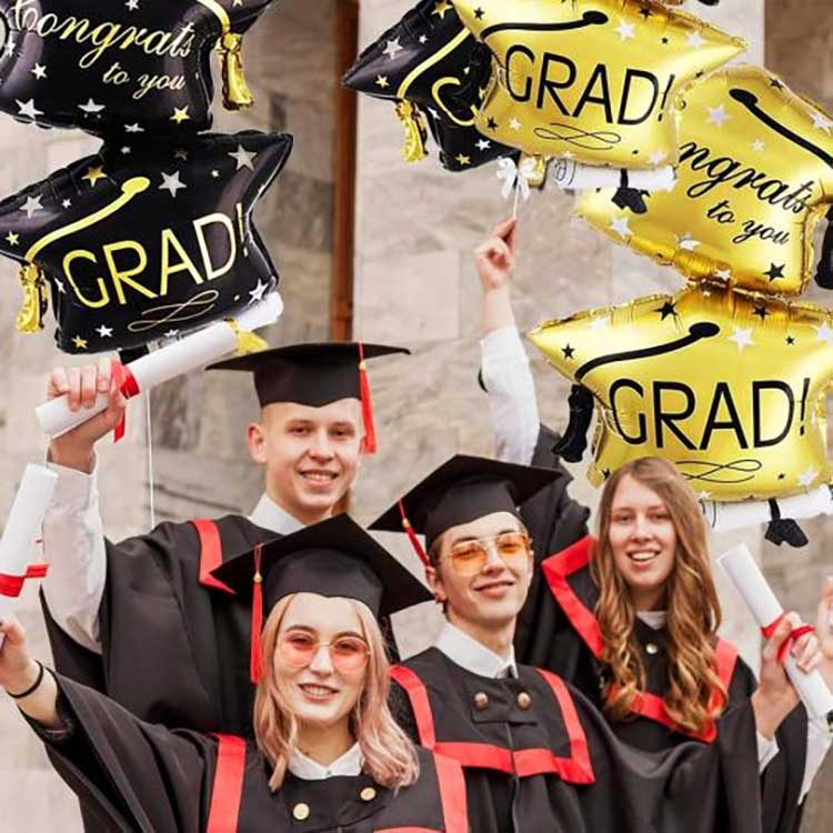 Il nostro set di palloncini con cappello di laurea da 32 pollici è realizzato con pellicola PET alluminata di alta qualità da 18 micron di spessore. Questa pellicola ha un'eccellente elasticità, si gonfia completamente e in modo soffice ed è resistente alla compressione e agli urti, perfetta per scuole e luoghi simili. Utilizziamo inchiostri ecologici per la stampa, ottenendo colori vivaci e uniformi resistenti allo sbiadimento. Anche dopo ore di esposizione alla luce solare diretta, come durante le cerimonie di laurea all'aperto, i motivi e i colori rimangono vibranti come sempre.