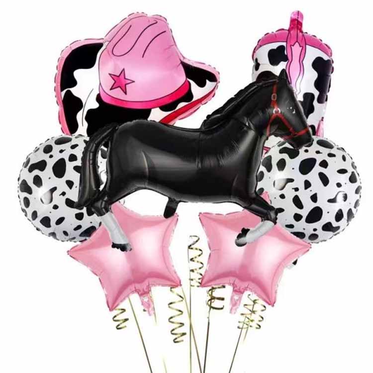 Con contorni di linea precisi e corrispondenza dei colori, ripristinano i contorni dei muscoli e le criniere fluenti dei cavalli in corsa, mentre gli schemi di colori naturali comuni come il marrone e il nero si adattano meglio all'immagine reale dei cavalli. Alcuni palloncini foil a tema cowboy aggiungono anche colori metallici come argento e oro per aumentare l'impatto visivo; il motivo della mucca è circolare, con motivi di mucca in bianco e nero stampati su di esso, e alcuni stili aggiungono alcune decorazioni tridimensionali come campanelle e plùle code di pesce sotto i palloncini in alluminio, che sono carini e hanno uno stile rurale, e sono un tema molto popolare per le attività da cowboy per famiglie.