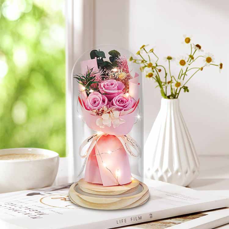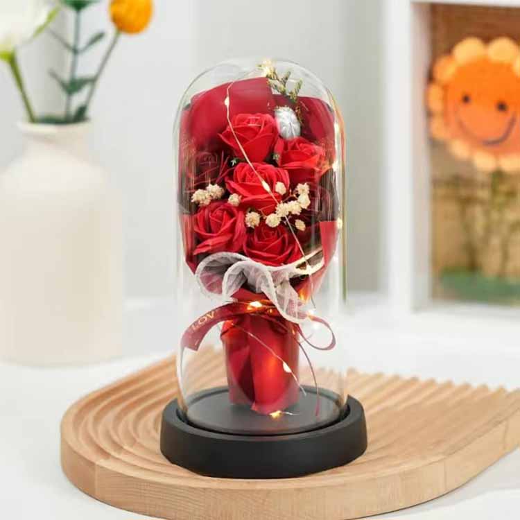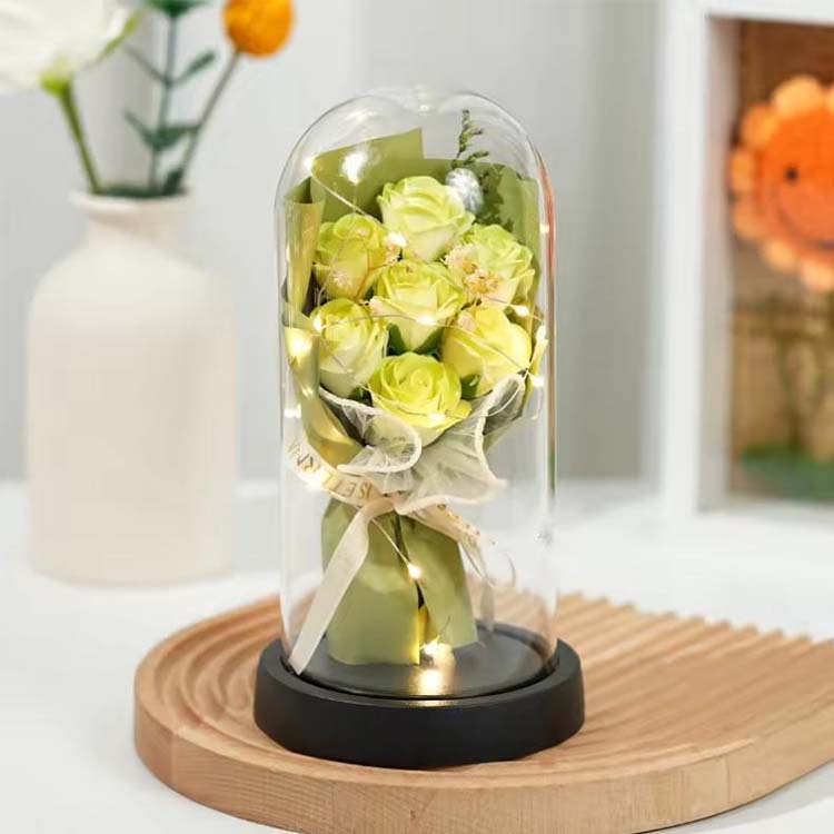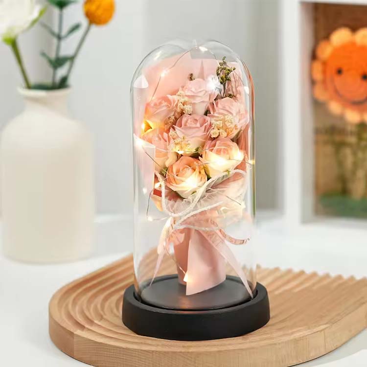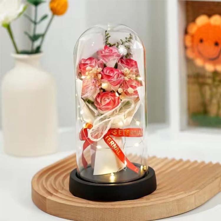 Il nostro bouquet di rose di sapone con cupola in vetro con confezione regalo a LED combina funzionalità pratica con significato sentimentale, rendendolo un regalo degno di nota. Che tu stia aggiungendo un tocco di romanticismo alla tua casa o inviando un regalo speciale a qualcuno di speciale, sarà un regalo caldo e indimenticabile.
