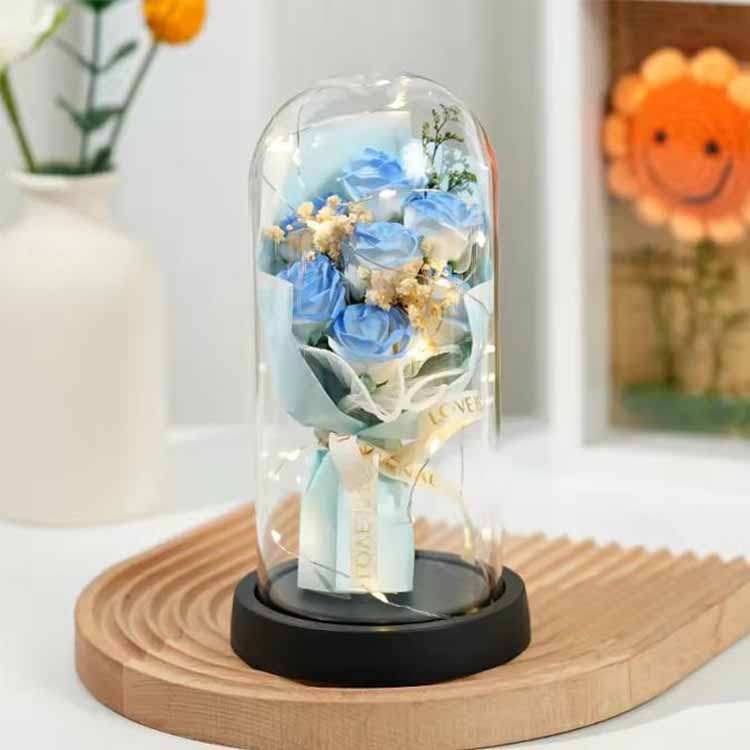 Il bouquet di rose di sapone con cupola in vetro con LED viene utilizzato in combinazione con fiori di sapone e fiori stabilizzati. Le luci a LED utilizzano una luce calda e non abbagliante, che può aggiungere un'atmosfera calda durante la decorazione delle scene. La stringa di luci a LED incorporata ha anche luci lampeggianti colorate e i colori possono essere personalizzati per soddisfare le tue esigenze. Questo bouquet con copertura in vetro può essere utilizzato per ambientare scene, come compleanni, anniversari, proposte di matrimonio, ecc., e può anche essere regalato come regalo regalo.I fiori eterni non appassiranno e non cambieranno colore anche con una copertura di vetro. I fiori di sapone possono essere utilizzati anche per lavarsi le mani o come profumo. Questo bouquet di rose è economico e pratico.