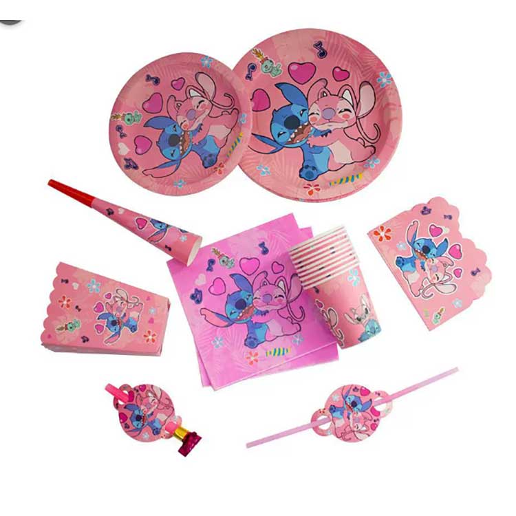 Un set di piatti usa e getta Stitch include i seguenti prodotti: piatti da 7 pollici (10 pezzi/borsa), piatti da 9 pollici (10 pezzi/borsa), tovaglioli (20 pezzi/borsa), gagliardetti (10 pezzi/borsa), sacchetti regalo per la restituzione (10 pezzi/borsa), scatole di popcorn (6 pezzi/borsa), draghi soffianti (6 pezzi/borsa), cappelli di carta (6 pezzi/borsa), bicchieri di carta (10 pezzi/borsa), corna (6 pezzi/borsa), cannucce (10 pezzi/borsa), biglietti d'invito (10 pezzi/confezione), maschere (10 pezzi/confezione), cucchiai, posate (10 pezzi/confezione) e tovaglia (1 pezzo/confezione). Il set contiene 17 diversi tipi di prodotto. I clienti possono scegliere di acquistare l'intero set o selezionare solo una parte degli articoli per soddisfare le loro esigenze.